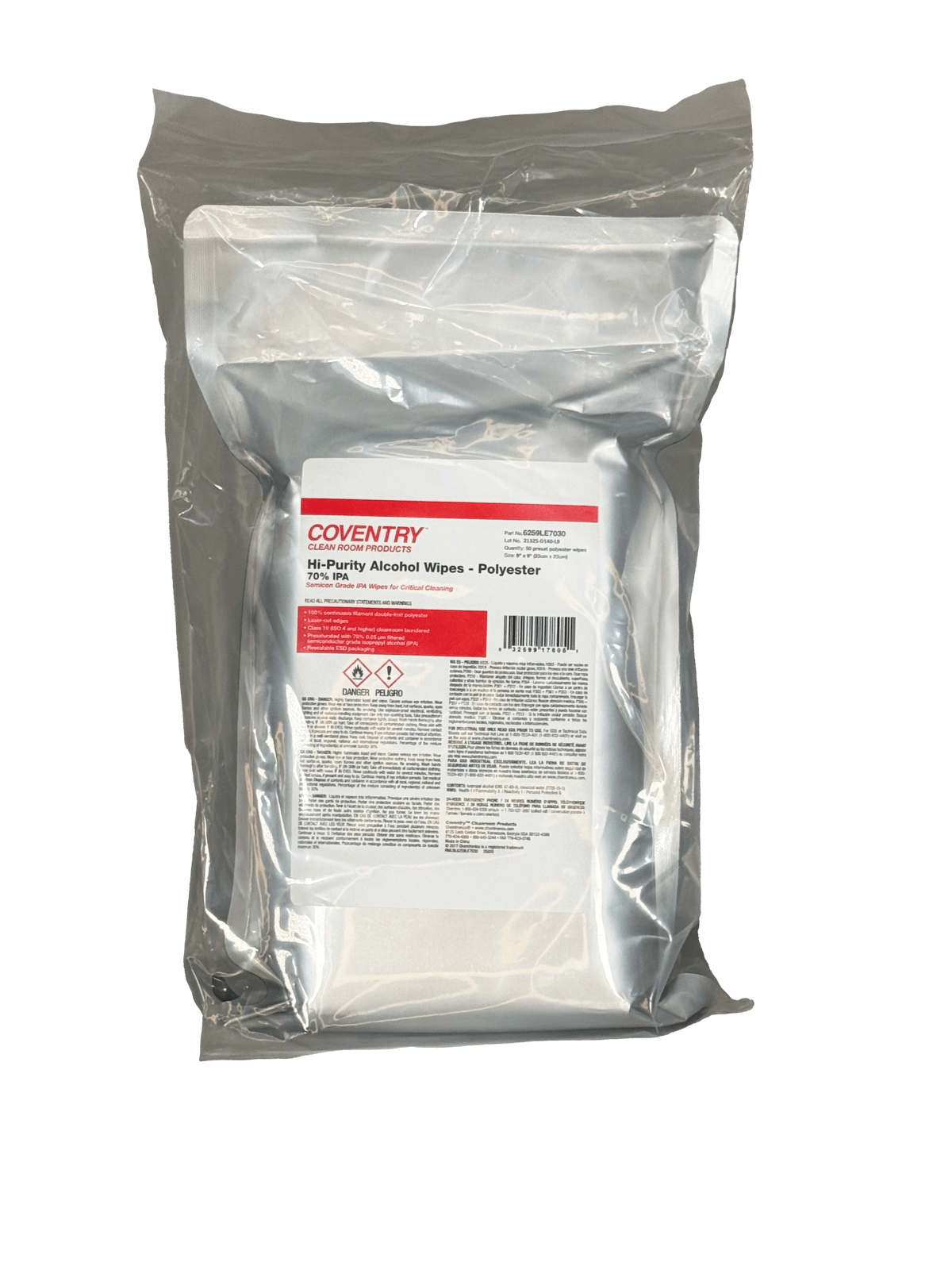 Coventry™ Hi-Purity cleanroom wipes are made from laundered knitted polyester fabric which is presaturated to provide excellent absorbency and contamination entrapment in critical cleaning environments. These wipes are extremely durable (0.48mm thickness, 400g wt.), perfect for abrasive and irregular surfaces. The solution is 70% Semiconductor Grade IPA (isopropyl alcohol) and 30% deionized water, safe for critical surfaces, including most plastics and metals. The laser sealed edges prevent loose fibers, leaving a clean surface without residue and unwanted particulants. These wipes are processed and packaged in a Class 10 (M3, ISO 4) cleanroom, where they are placed in resealable, ESD-safe packaging.