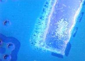 Corrosion from PCB fabrication contamination (photo courtesy of Foresite)