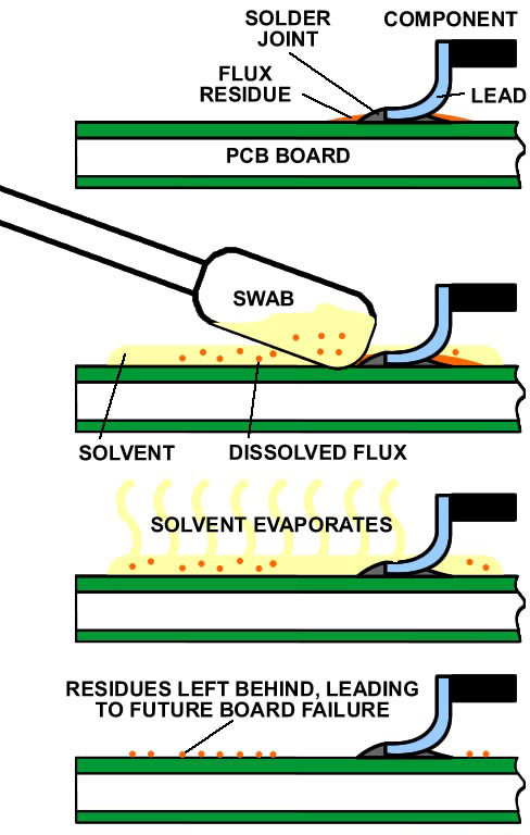 Flux residues left on electronic circuit boards are acidic. If they aren’t removed with a cleaning process, the residues can draw in ambient moisture from the air and lead to corrosion of component leads and PCB contacts.