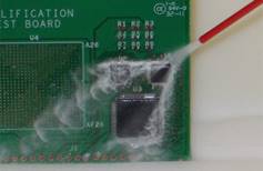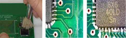 In our testing, handheld brushes and swabs left the board looking dirtier than it started. They spread partially solvated flux around the components which then dried, leaving a white residue. None of the polyurethane foam swabs performed well in this application. Foam swabs became flimsy when saturated with aggressive solvents and were easily torn. Another problem with handheld tools was that the solvent evaporated too quickly. Best results were achieved when a final rinse was utilized. The key is not to let the board dry out. When the board dries, the partially solvated flux dries leaving behind white residue. A slower evaporating solvent, like IPA, would avoid the evaporation issue but should be followed by a rinse (see more details on rinsing below). In addition, some solvent may travel under the component during scrubbing, but without the force of an aerosol spray the likelihood that the residues beneath the component will be removed is slim..